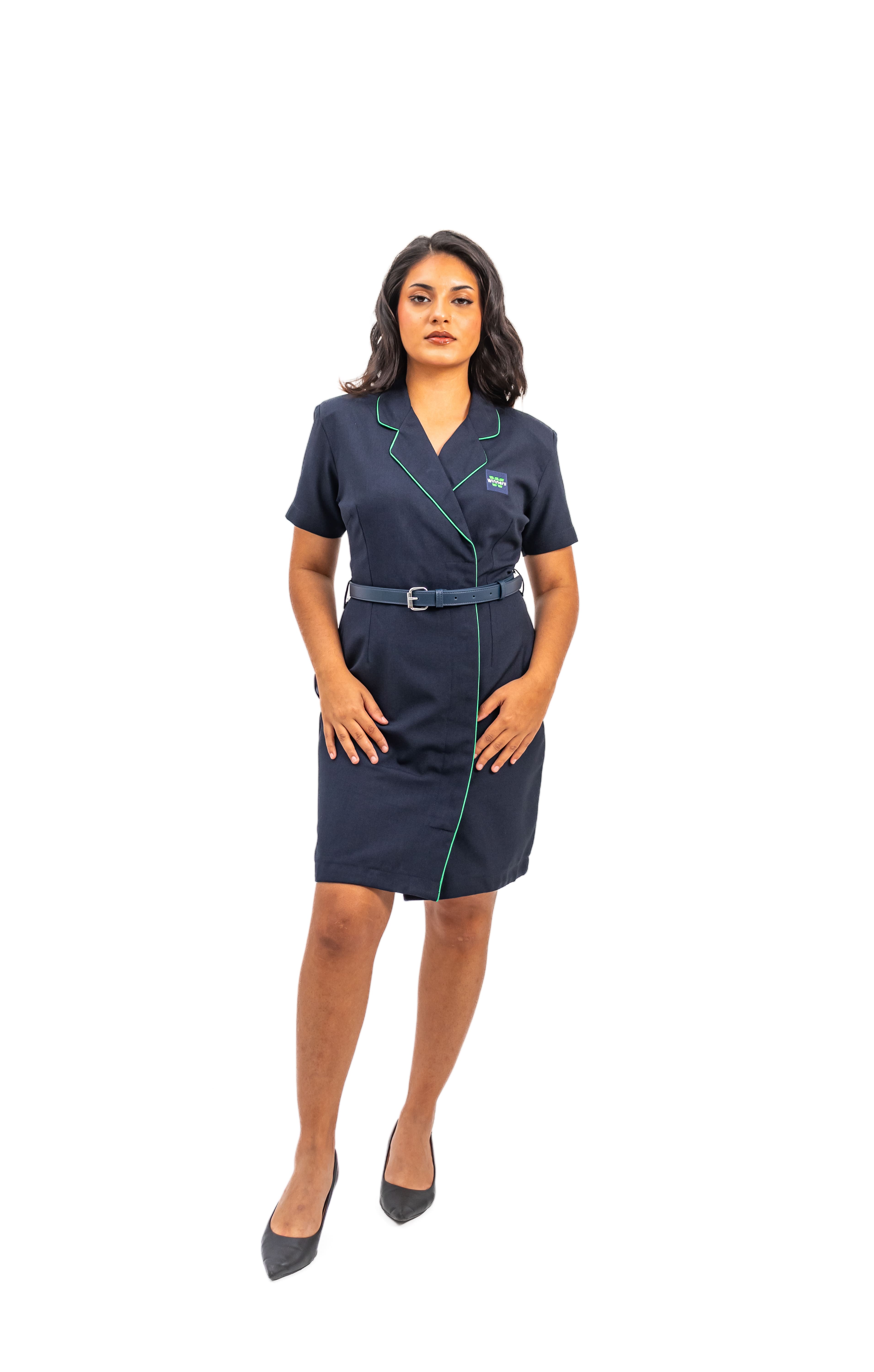 With a minimalist approach to design in mind, our WREN dress features a tonal belt, and contrast piping details on the edge of the notched lapels.