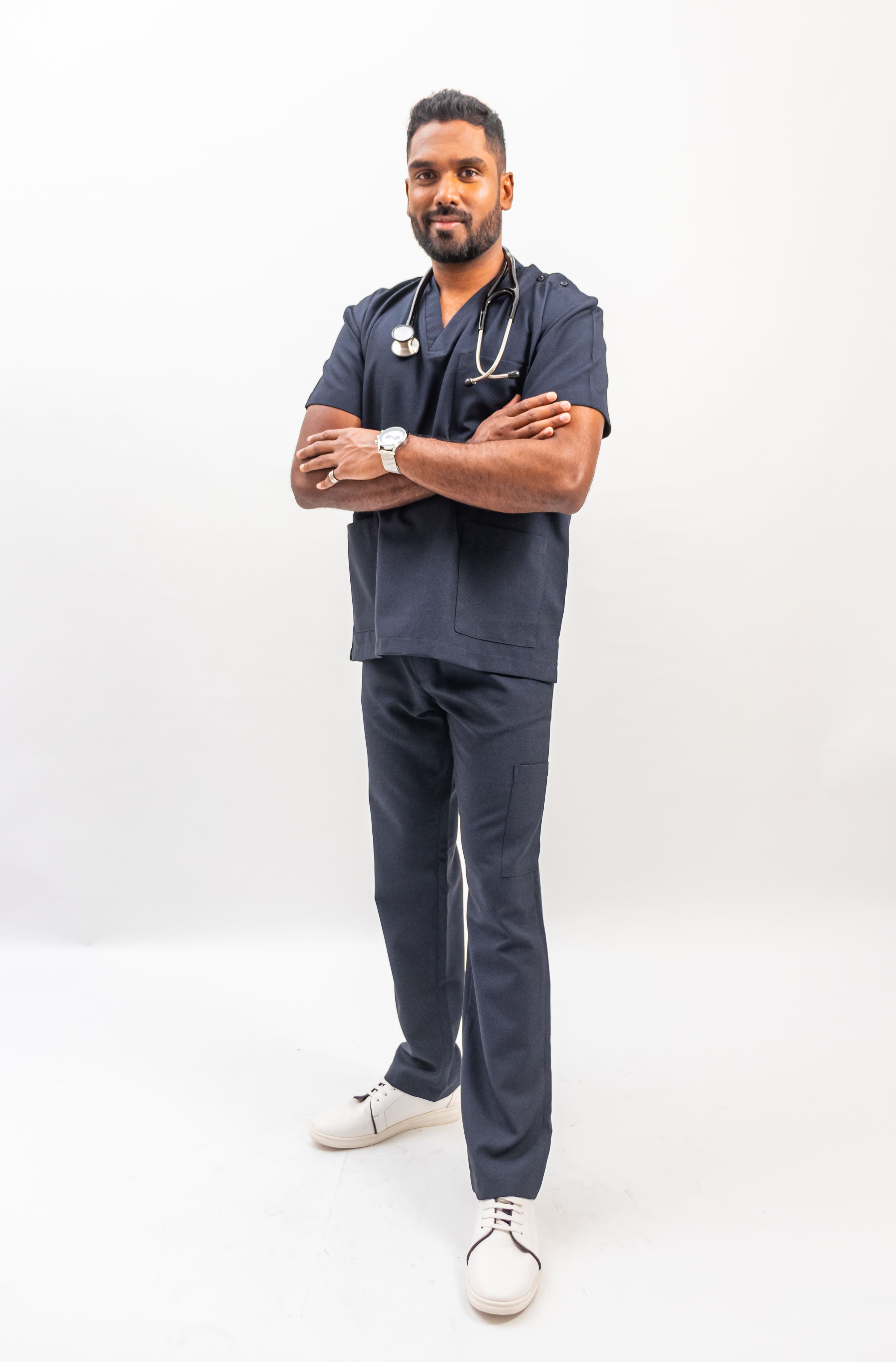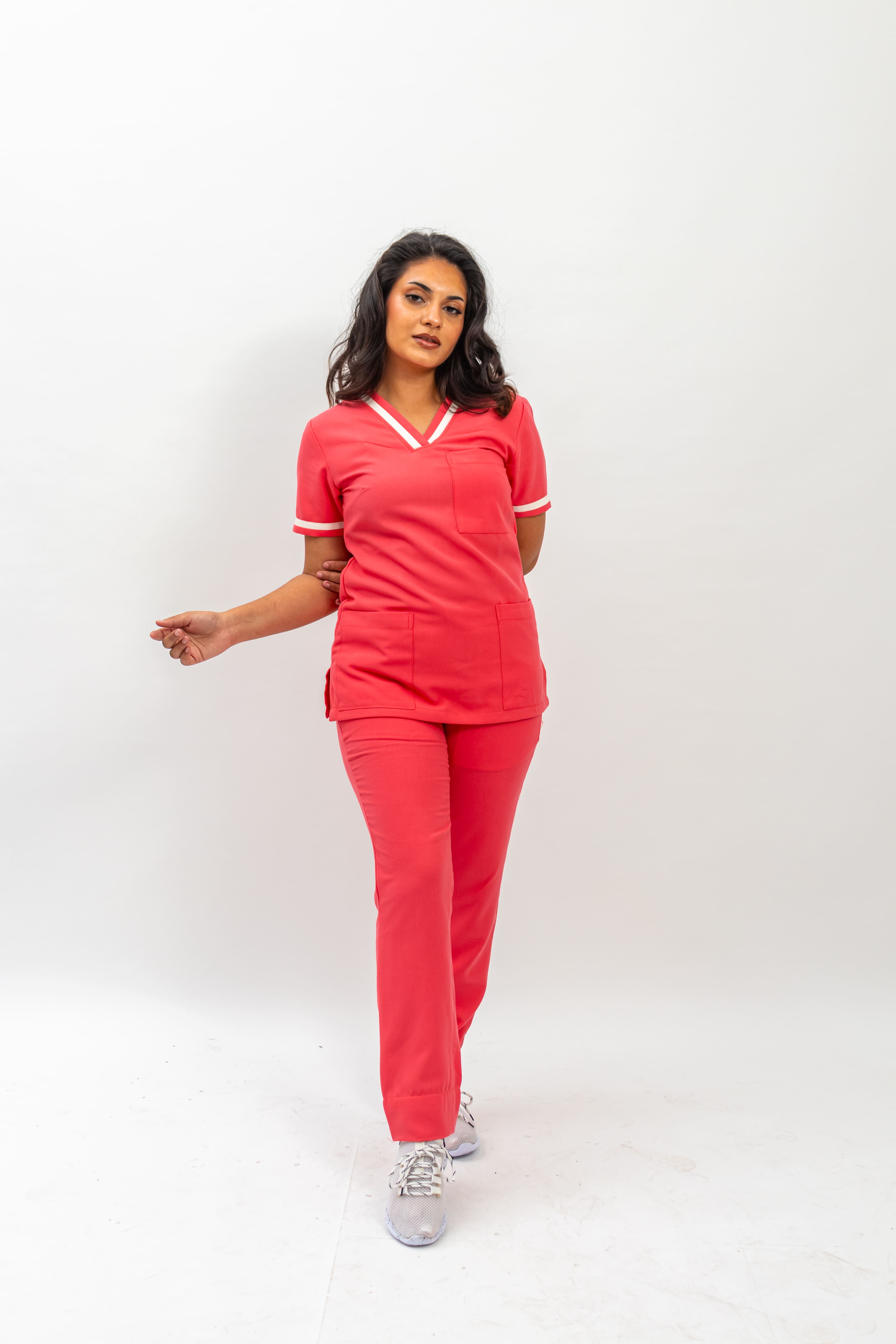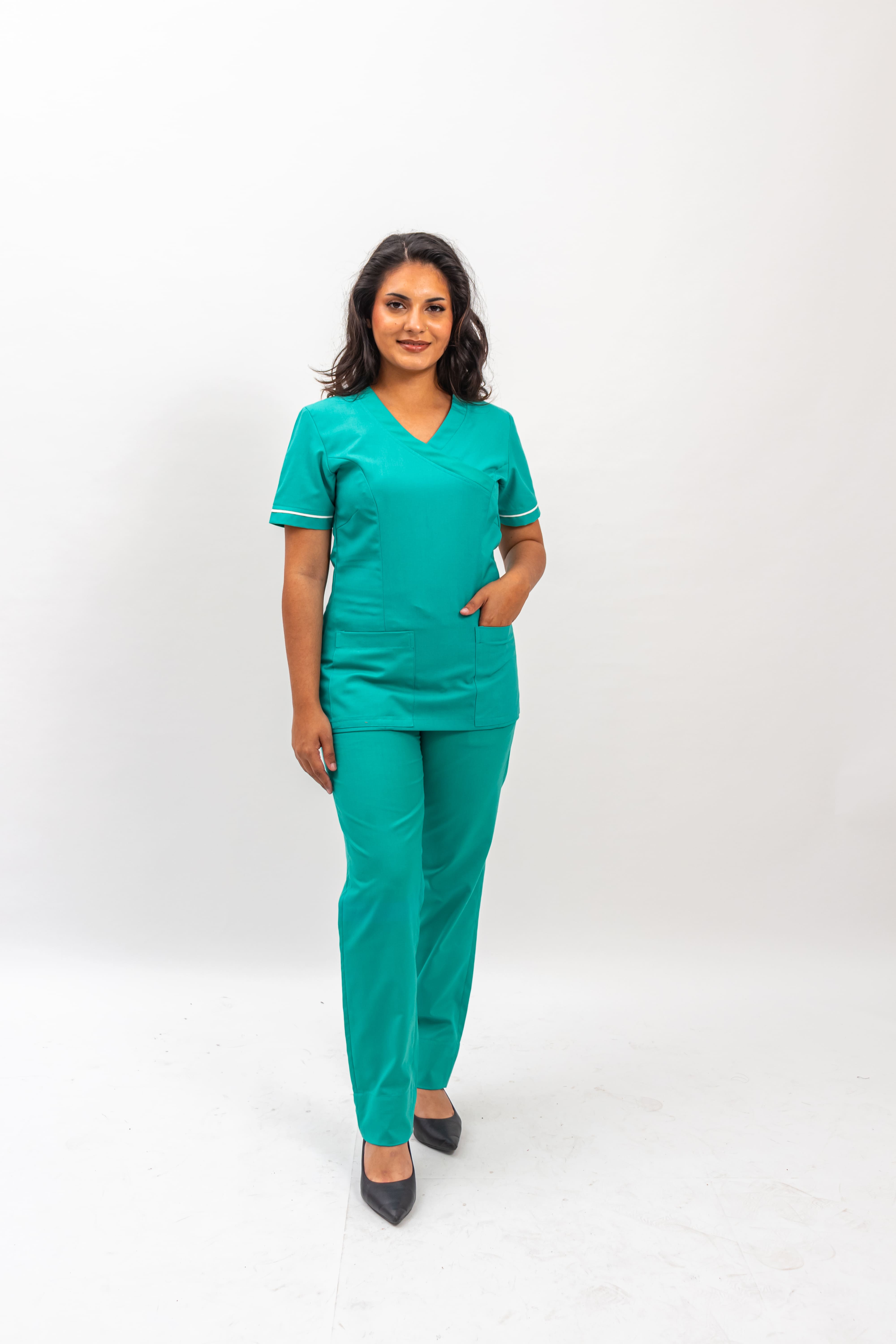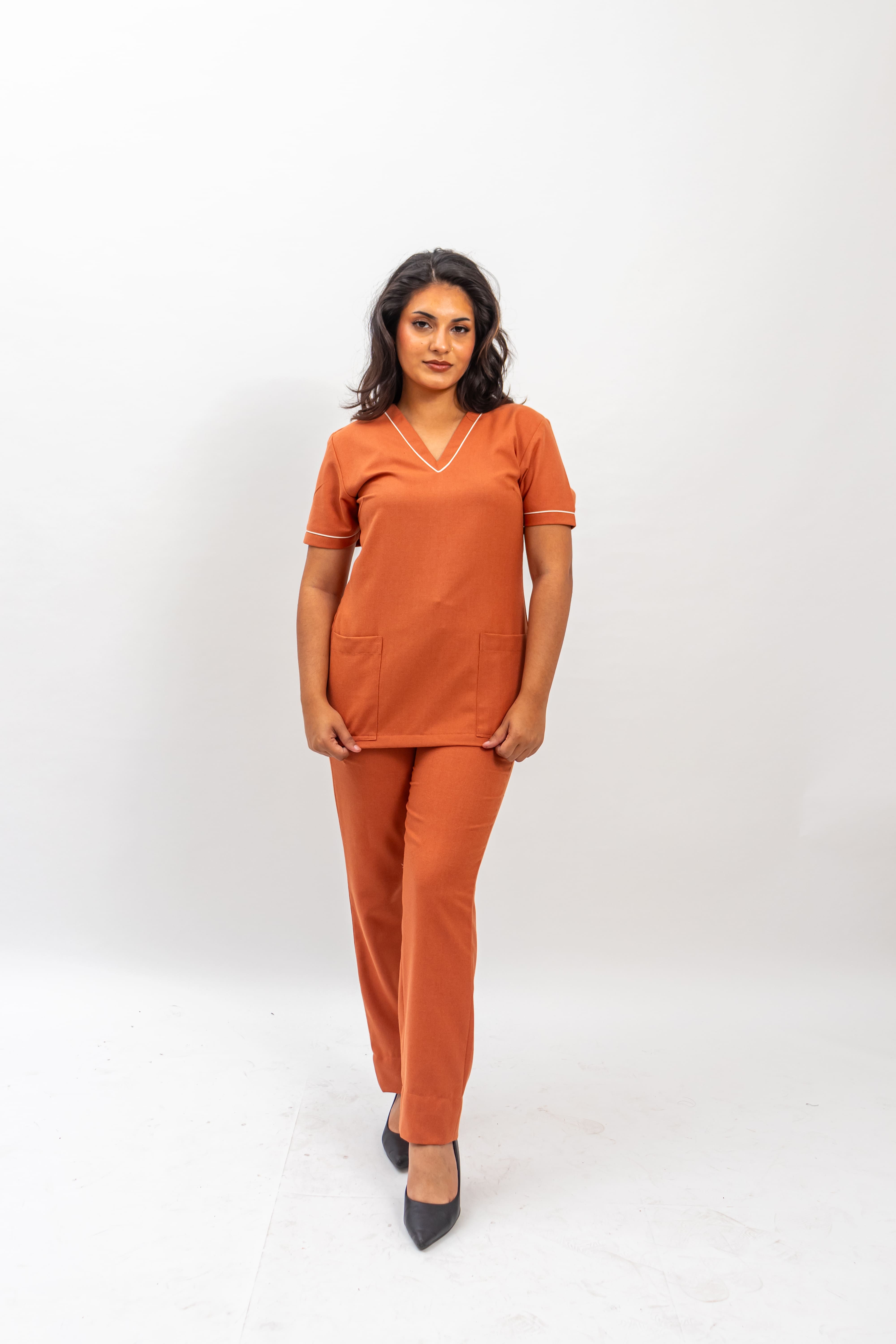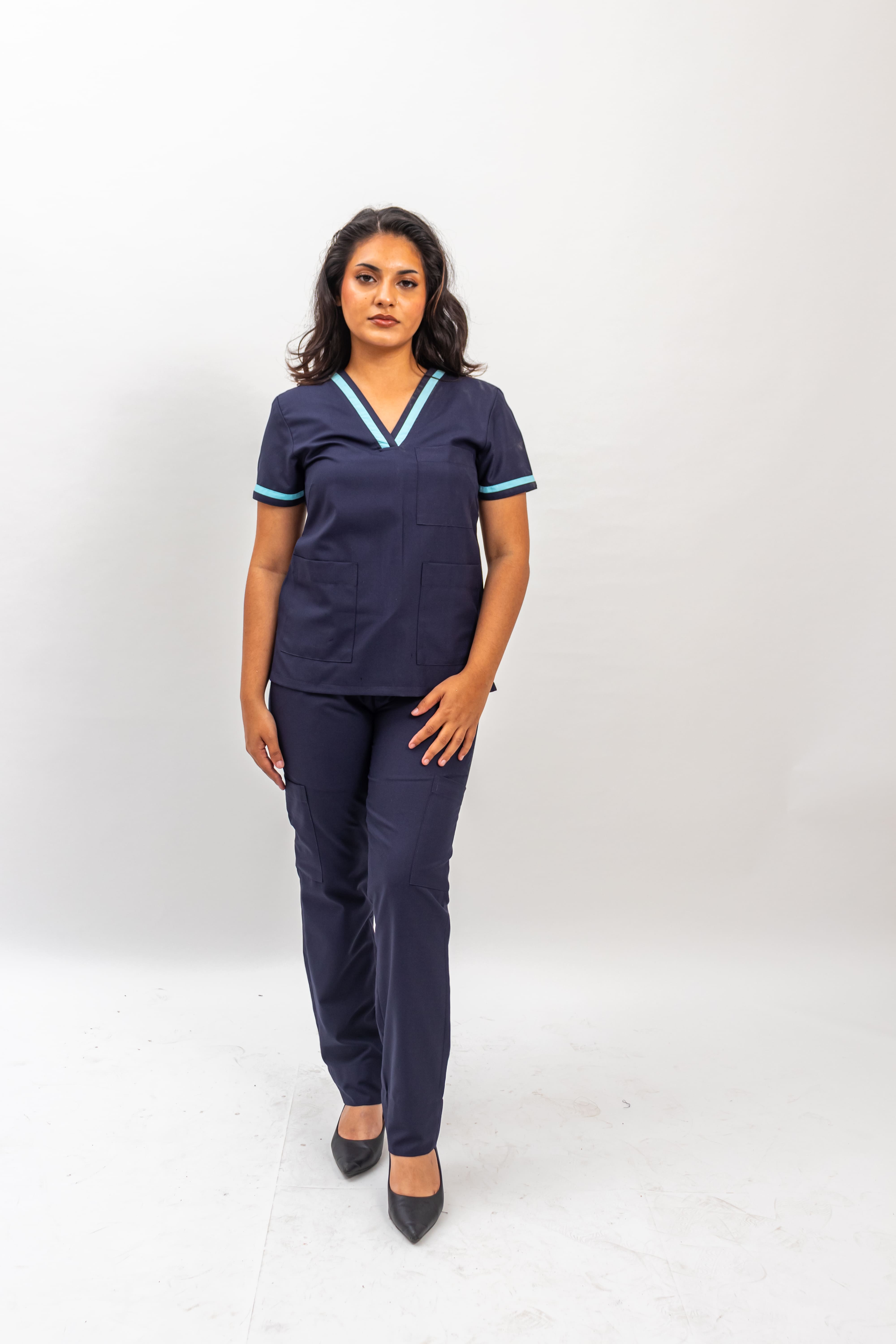 Our ARIA SET consists of a perfectly fitted tunic with a faux crossover V-neck, 2 patch pockets and contrast piping on the sleeves. It also includes a pant with an elasticated waistband and drawstring.