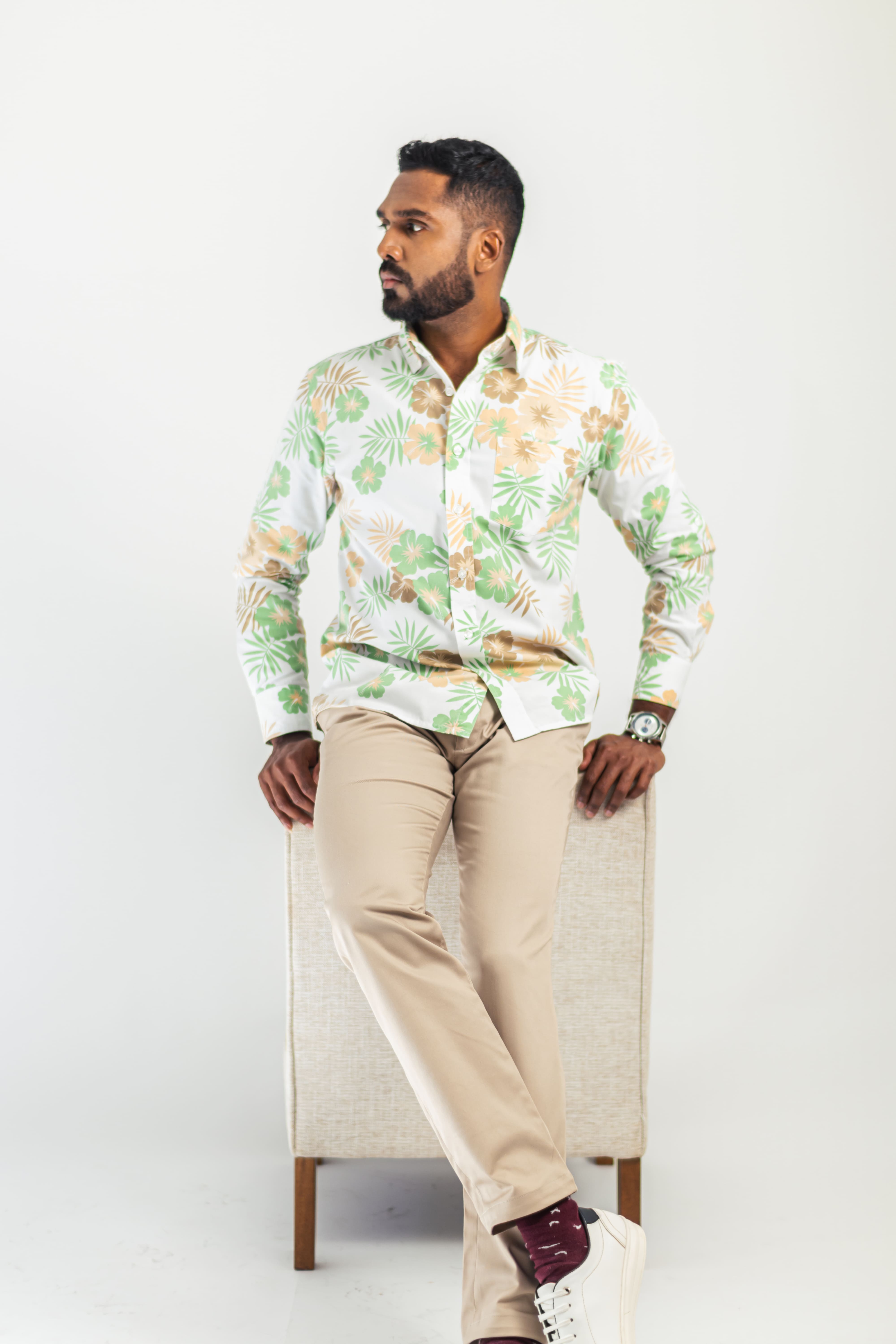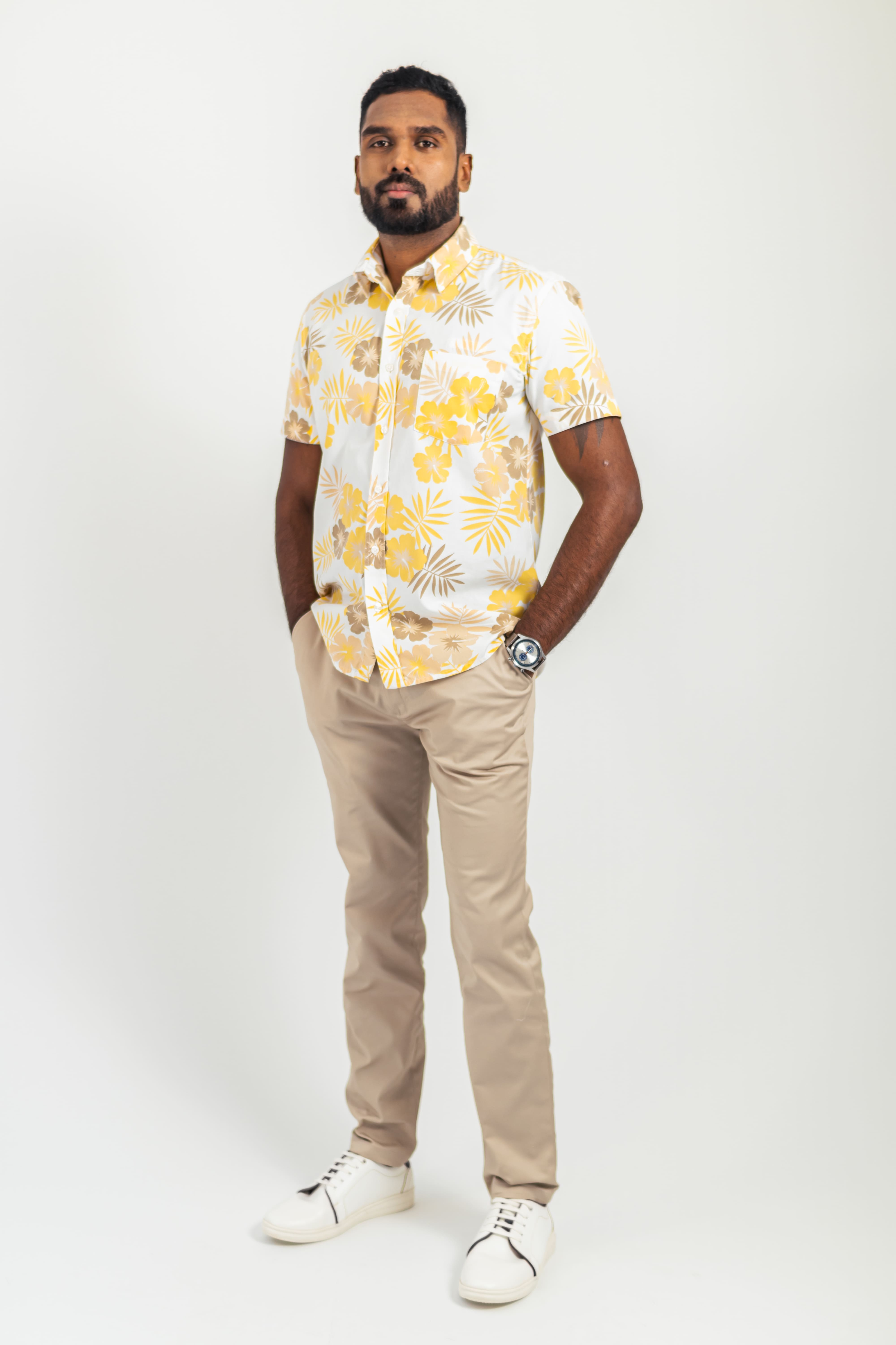 Letting the personalized fabric do the talking, ALEX is a short-sleeved, classic-collared yellow floral shirt with a chest pocket.