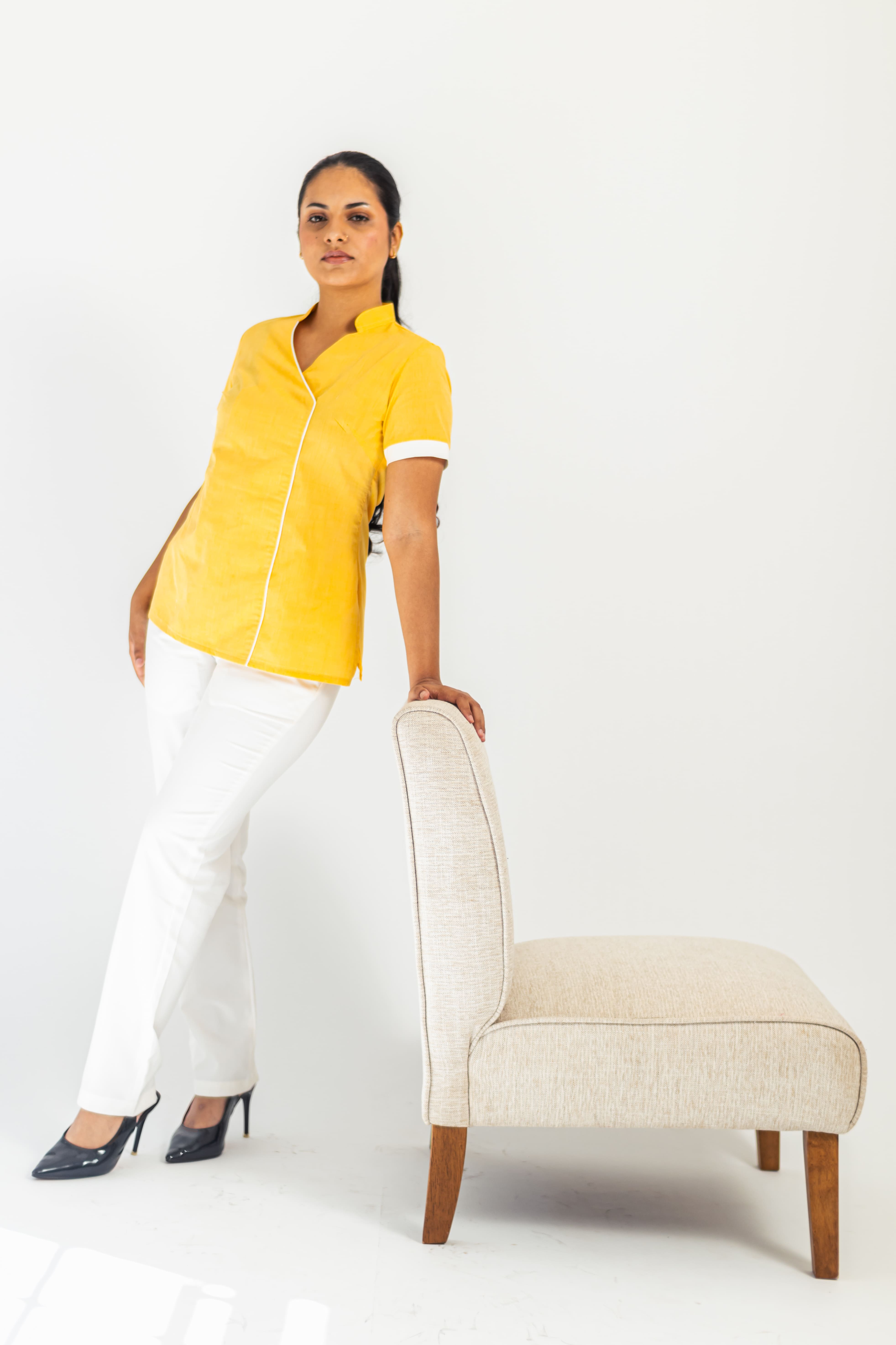 Our LAURENT shirt delivers simplicity and distinctiveness through the contrasting band on the sleeves and the bright yellow colour.
