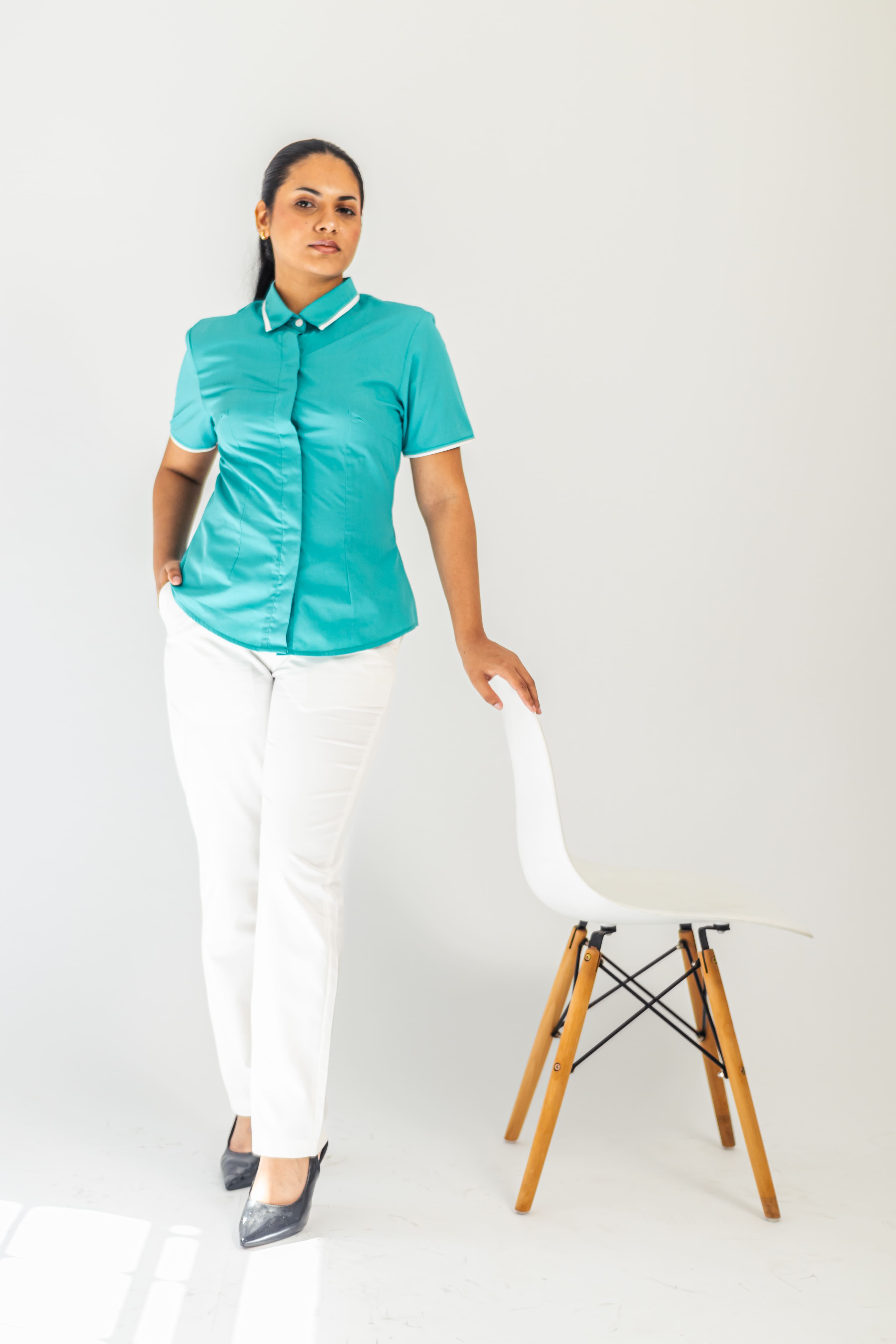 JULIE, a timeless collared blouse with contrast details on the collar and sleeves, radiates comfort and style. The concealed button placket gives it a neat and chic look.