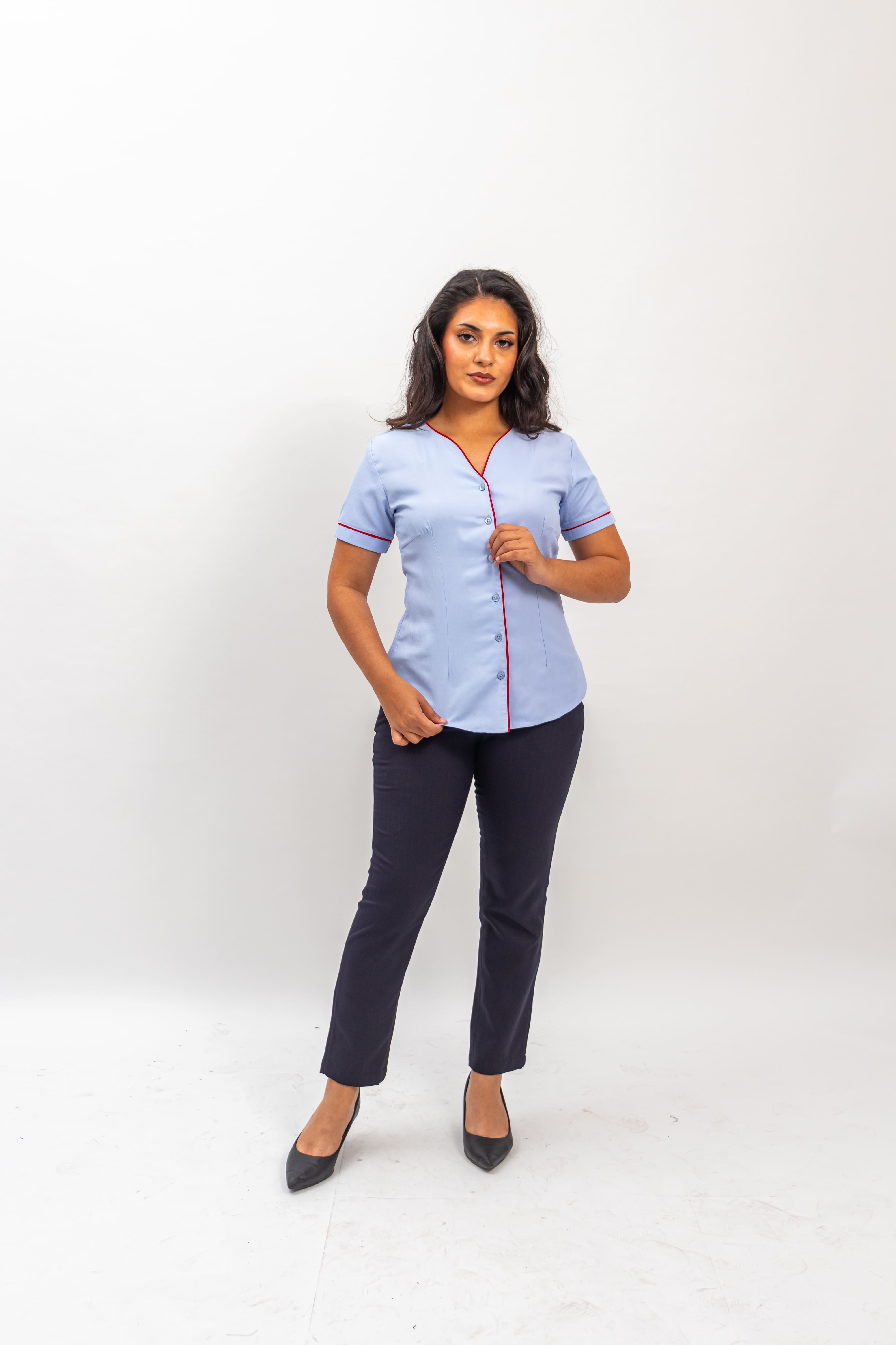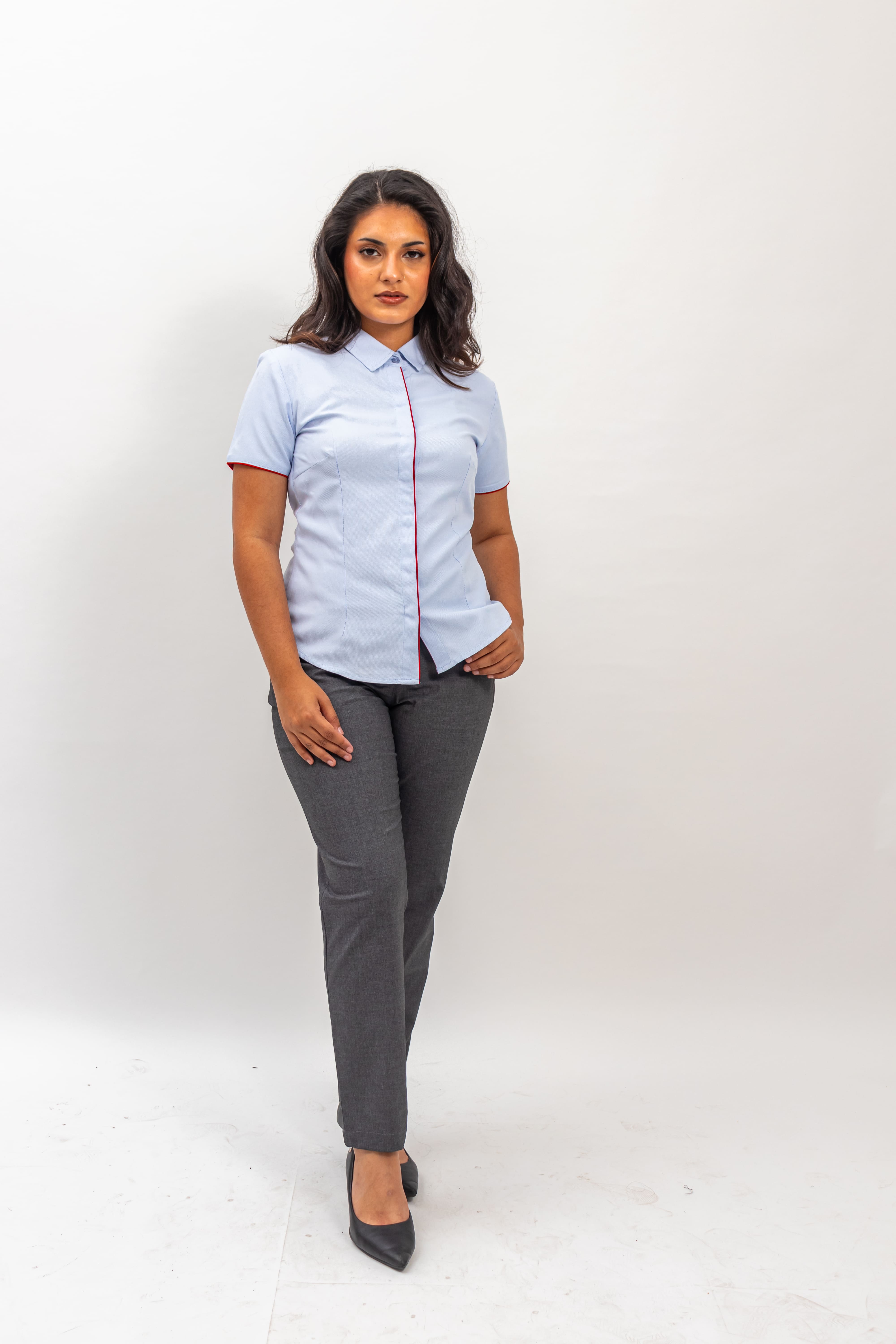 Our KELLY blouse has contrast piping details on the neckline, sleeves and along the buttoned placket. It has the perfect fit thanks to the bust darts and double darts in front.