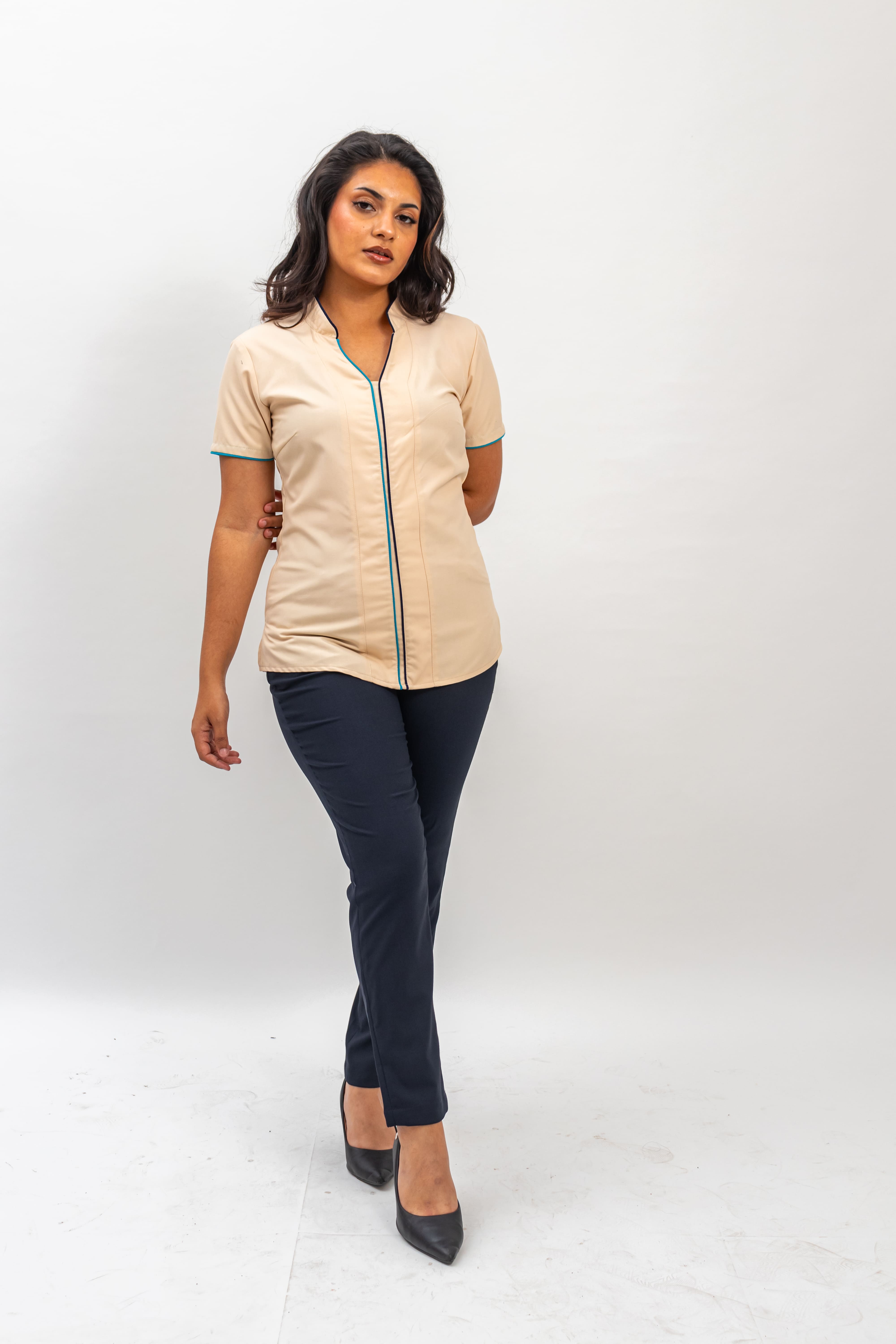 Special attention to details is evident in the contrast piping colours on the sleeves, Mao collar and extended V-cut. The bust darts allow our PARIS tunic to have a streamlined silhouette.